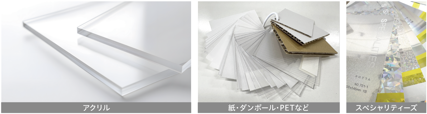 什器にはいろいろな素材が使用されています。一般的なのは安価な紙の什器です。部分的にPETや蒸着紙(金銀・ホログラムなどの特殊な紙)を使用して目立たせているものもあります。高級感を演出したい商品の場合はアクリル什器を使っていたりします。