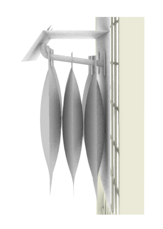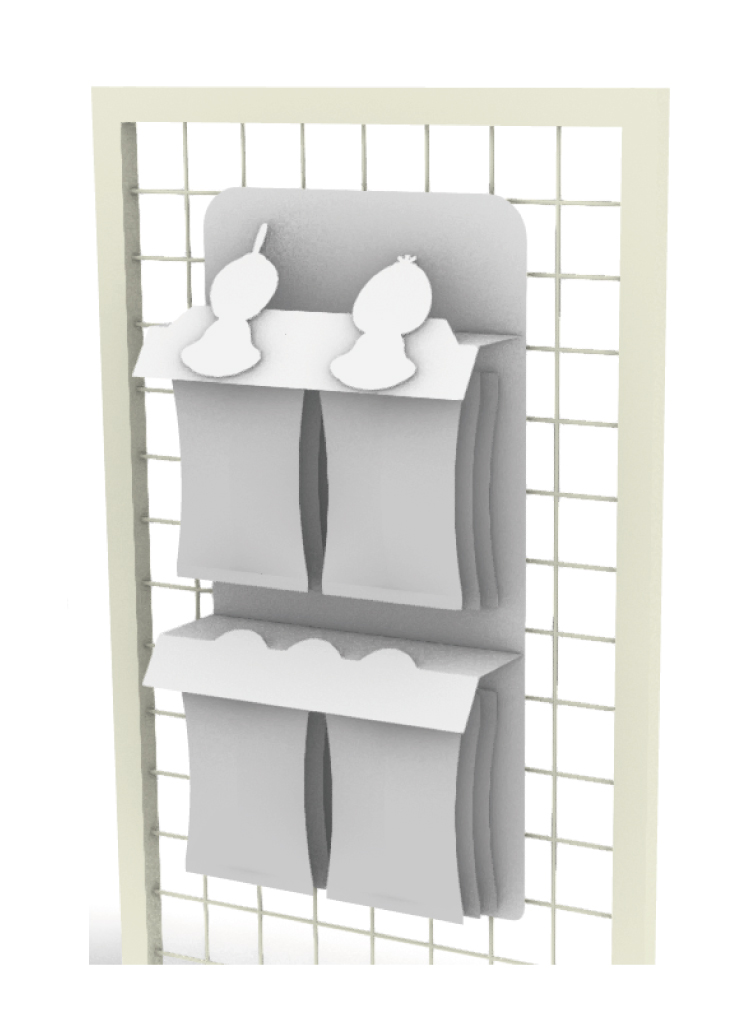 画像の什器は、フックの上部に屋根のようなパーツを取り付けた構造になっています。非常にシンプルなつくりですが、この部分に商品訴求や世界観の演出を加えることができるため、売り場での印象を効果的に高められます。また、構造が単純な分コストも抑えられる点が大きなメリットです。