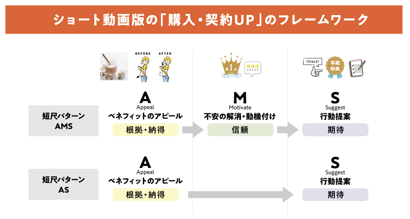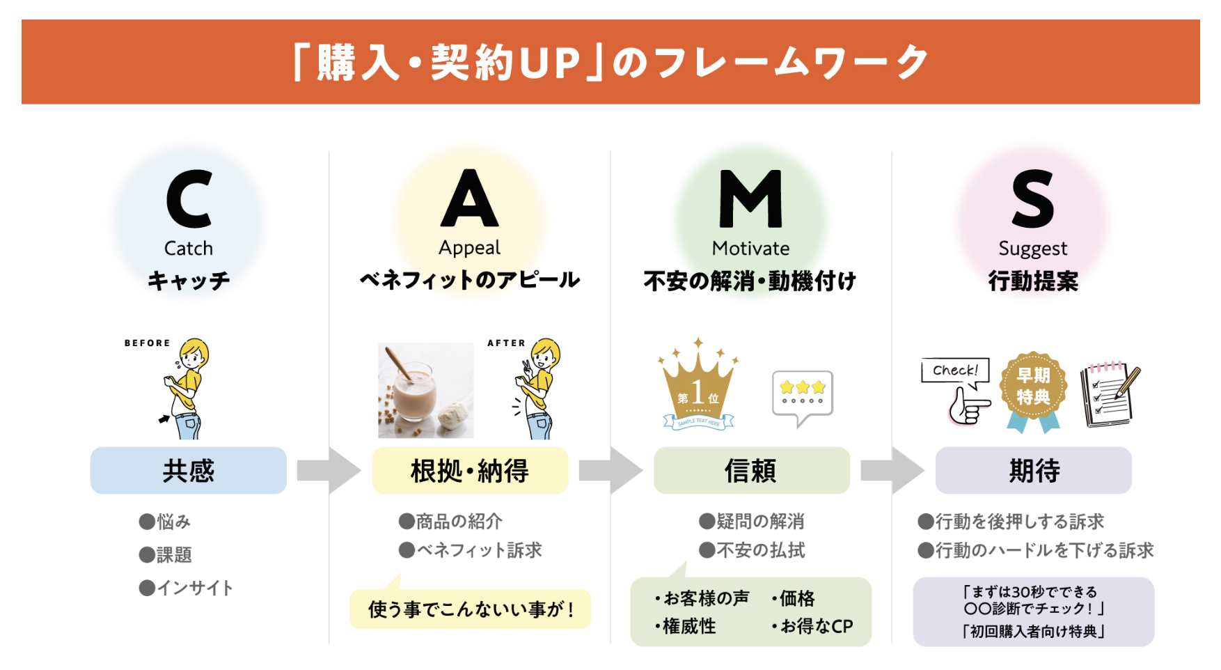 「購入・契約UP」のフレームワークは、動画構成でよく使われる「CAMS ( キャムズ)」で考えていきます。