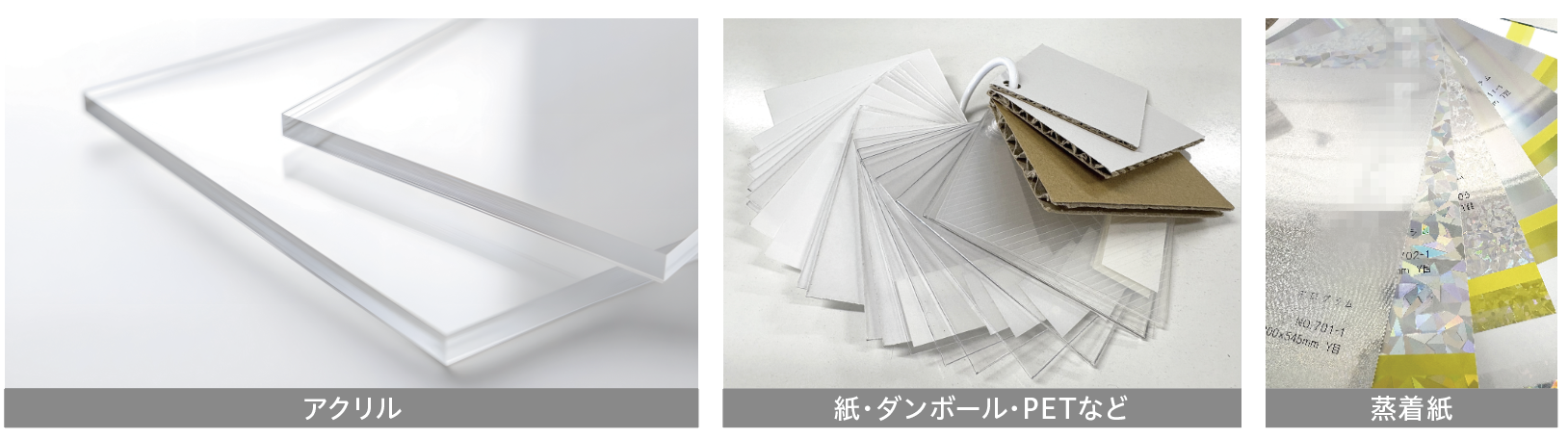 什器にはいろいろな素材が使用されています。一般的なのは安価な紙の什器です。部分的にPETや蒸着紙(金銀・ホログラムなどの特殊な紙)を使用して目立たせているものもあります。高級感を演出したい商品の場合はアクリル什器を使っていたりします。