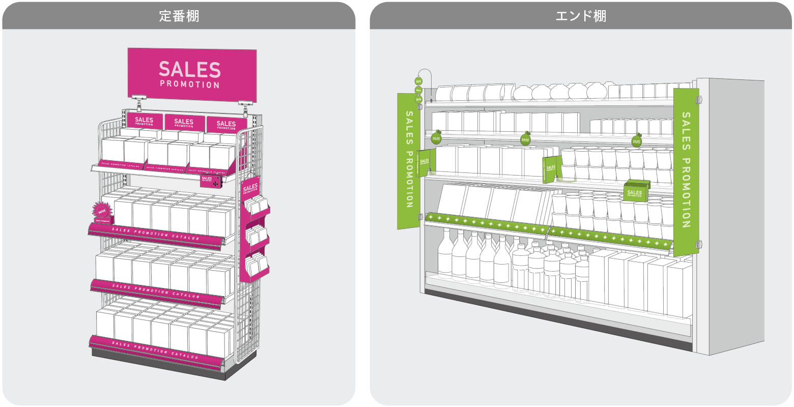 販促物は什器だけではなく、色んなツールがあります。スタンドPOPやレールの中に入れる帯POP、香り見本やディバイダー、音声POP、ムービングPOPなどなど…。売り場も定番棚の上段や下段、エンド、特別に設置された場所など色々です。